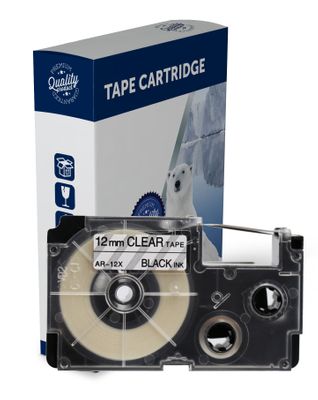 Black Text on 12mm wide Clear Label Tape for use in Casio (XR12X) KL60, KL60SR, KLHD1, KL100, KL120,KL750, KL780,KL1500, KL2000, KLP1000, CWL300, KL430,KL820, KL7000,KL7200, KL8100,KL8200, KLC500 - 12mm wide x 8 metres long