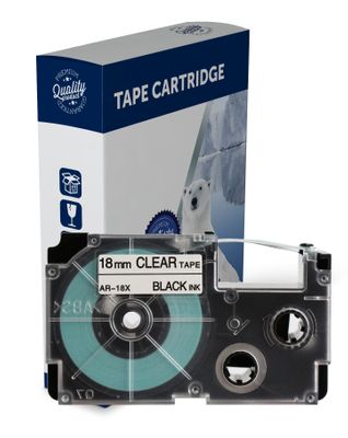 Black Text on 18mm wide Clear Label Tape for use in Casio (XR18X) KLHD1, KL100, KL120,KL750, KL780,KL1500, KL2000, KLP1000, CWL300, KL430,KL820, KL7000,KL7200, KL8100,KL8200, KLC500 - 18mm wide x 8 metres long