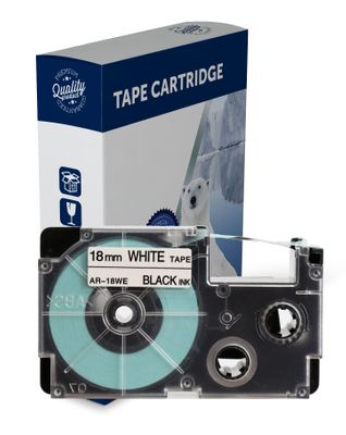 Black Text on 18mm wide White Label Tape for use in Casio (XR18WE) KLHD1, KL100, KL120,KL750, KL780,KL1500, KL2000, KLP1000, CWL300, KL430,KL820, KL7000,KL7200, KL8100,KL8200, KLC500 - 18mm wide x 8 metres long