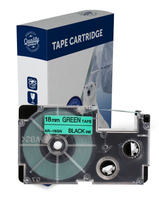 Black Text on 18mm wide Green Label Tape for use in Casio (XR18GN) KLHD1, KL100, KL120,KL750, KL780,KL1500, KL2000, KLP1000, CWL300, KL430,KL820, KL7000,KL7200, KL8100,KL8200, KLC500 - 18mm wide x 8 metres long