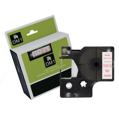 Red Text on Clear Tape for use in Dymo (SD43612) LABELMANAGER210D, LABELMANAGERPnP, LABELMANAGER220P, LABELMANAGER260P, LABELMANAGER360D, LABELMANAGER420P, LABELMANAGER450D - 6mm wide x 7 metres long