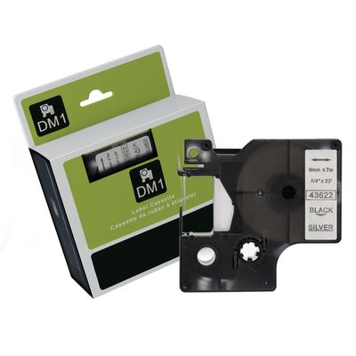 Black Text on Silver Tape for use in Dymo (SD43622) LABELMANAGER210D, LABELMANAGERPnP, LABELMANAGER220P, LABELMANAGER260P, LABELMANAGER360D, LABELMANAGER420P, LABELMANAGER450D - 6mm wide x 7 metres long