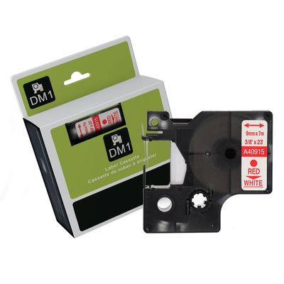 Red Text on White Tape for use in Dymo (SD40915) LABELMANAGER120P, LABELMANAGER210D, LABELMANAGERPnP, LABELMANAGER220P, LABELMANAGER260P, LABELMANAGER360D, LABELMANAGER420P, LABELMANAGER450D - 9mm wide x 7 metres long