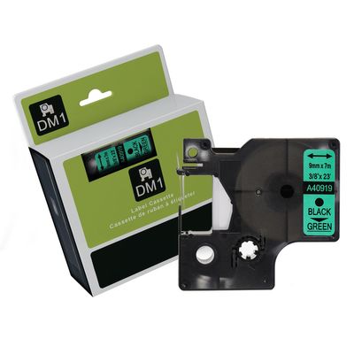 Black Text on Green Tape for use in Dymo (SD40919) LABELMANAGER120P, LABELMANAGER210D, LABELMANAGERPnP, LABELMANAGER220P, LABELMANAGER260P, LABELMANAGER360D, LABELMANAGER420P, LABELMANAGER450D - 9mm wide x 7 metres long