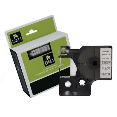 Black Text on Silver Tape for use in Dymo (SD40922) LABELMANAGER120P, LABELMANAGER210D, LABELMANAGERPnP, LABELMANAGER220P, LABELMANAGER260P, LABELMANAGER360D, LABELMANAGER420P, LABELMANAGER450D - 9mm wide x 7 metres long