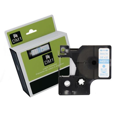 Blue Text on White Tape for use in Dymo (SD40914) LABELMANAGER120P, LABELMANAGER210D, LABELMANAGERPnP, LABELMANAGER220P, LABELMANAGER260P, LABELMANAGER360D, LABELMANAGER420P, LABELMANAGER450D - 9mm wide x 7 metres long