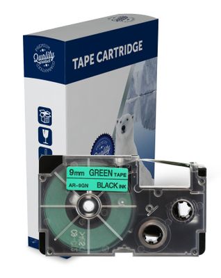 Black Text on 9mm wide Green Label Tape for use in Casio (XR9GN) KL60, KL60SR, KLHD1, KL100, KL120,KL750, KL780,KL1500, KL2000, KLP1000, CWL300, KL430,KL820, KL7000,KL7200, KL8100,KL8200, KLC500 - 9mm wide x 8 metres long