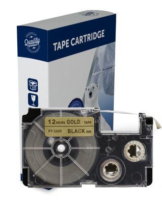 Black Text on 12mm wide Gold Label Tape for use in Casio (XR12GD) KL60, KL60SR, KLHD1, KL100, KL120,KL750, KL780,KL1500, KL2000, KLP1000, CWL300, KL430,KL820, KL7000,KL7200, KL8100,KL8200, KLC500 - 12mm wide x 8 metres long