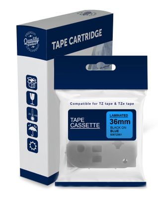 Black Text on Blue Laminated Tape for use in Brother (TZe561, TZ561) PT3600, PT9500PC, PT9600, PT9700PC, PT9800PCN, PTD800W, PTP900W, PTP950NW - 36mm wide x 8 metres long