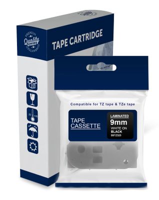 White Text on Black Laminated Tape for use in Brother (TZe325, TZ325) PT1000, PT1010, PT1090BK, PT1230PC, PT1280, PT1280DT, PT1290, PT1400, PT1650, PT1750, PT1830, PT1830SP, PT1880, PT1950, PT2030, PT2100, PT2300, PT2420PC, PT2430PC, PT2700, PT2730, PT360