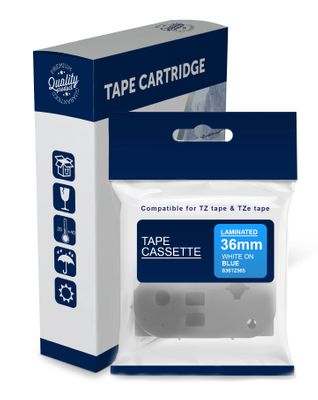 White Text on Blue Laminated Tape for use in Brother (TZe565, TZ565) PT3600, PT9500PC, PT9600, PT9700PC, PT9800PCN, PTD800W, PTP900W, PTP950NW - 36mm wide x 8 metres long