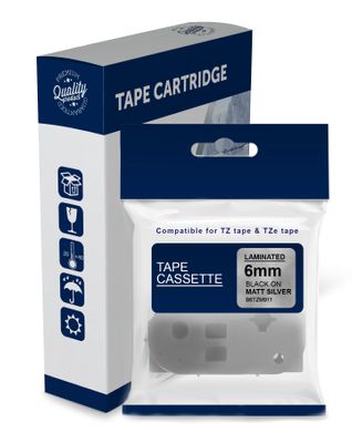 Black Text on Matt Silver Laminated Tape for use in Brother (TZeM911, TZM911) PT1000, PT1010, PT1090BK, PT1230PC, PT1280, PT1280DT, PT1290, PT1400, PT1650, PT1750, PT1830, PT1830SP, PT1880, PT1950, PT2030, PT2100, PT2300, PT2420PC, PT2430PC, PT2700, PT273